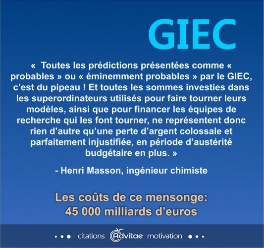 « Toutes les prédictions présentées comme « probables » ou « éminemment probables » par le GIEC, c’est du pipeau ! Et toutes les sommes investies dans les superordinateurs utilisés pour faire tourner leurs modèles, ainsi que pour financer les équipes de recherche qui les font tourner, ne représentent donc rien d’autre qu’une perte d’argent colossale et parfaitement injustifiée, en période d’austérité budgétaire en plus. »